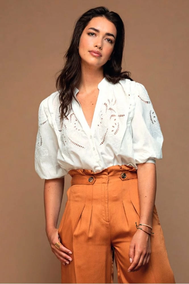 Blouse Ecru Embroidered detail Short, puff sleeves Button down front Cotton