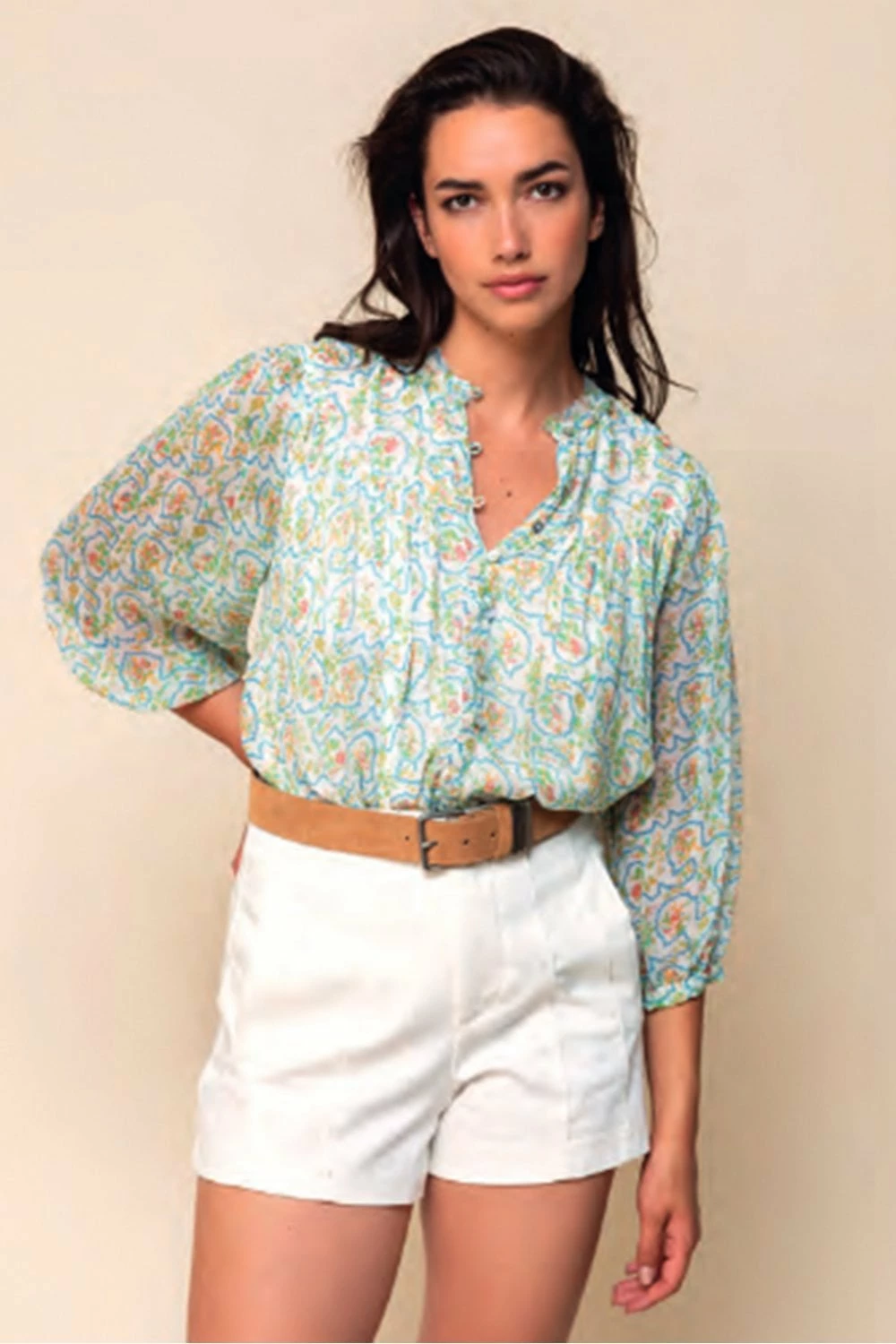 Blouse Green/blue Irio print 3/4 sleeve Half button placket Viscose