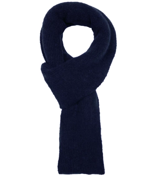 Maison Anje Lamilton Night Scarf, a soft and fluffy ribbed dark navy scarf with added stretch. Also available in cream, violet and brown these long rectangular shawl can be worn with the matching gloves and hat. 38% Polyamide, 26% Acrylic, 25% Alpaca, 10% Wool & 1% Elastane 192 x 36cm Hand wash cod and dry flat