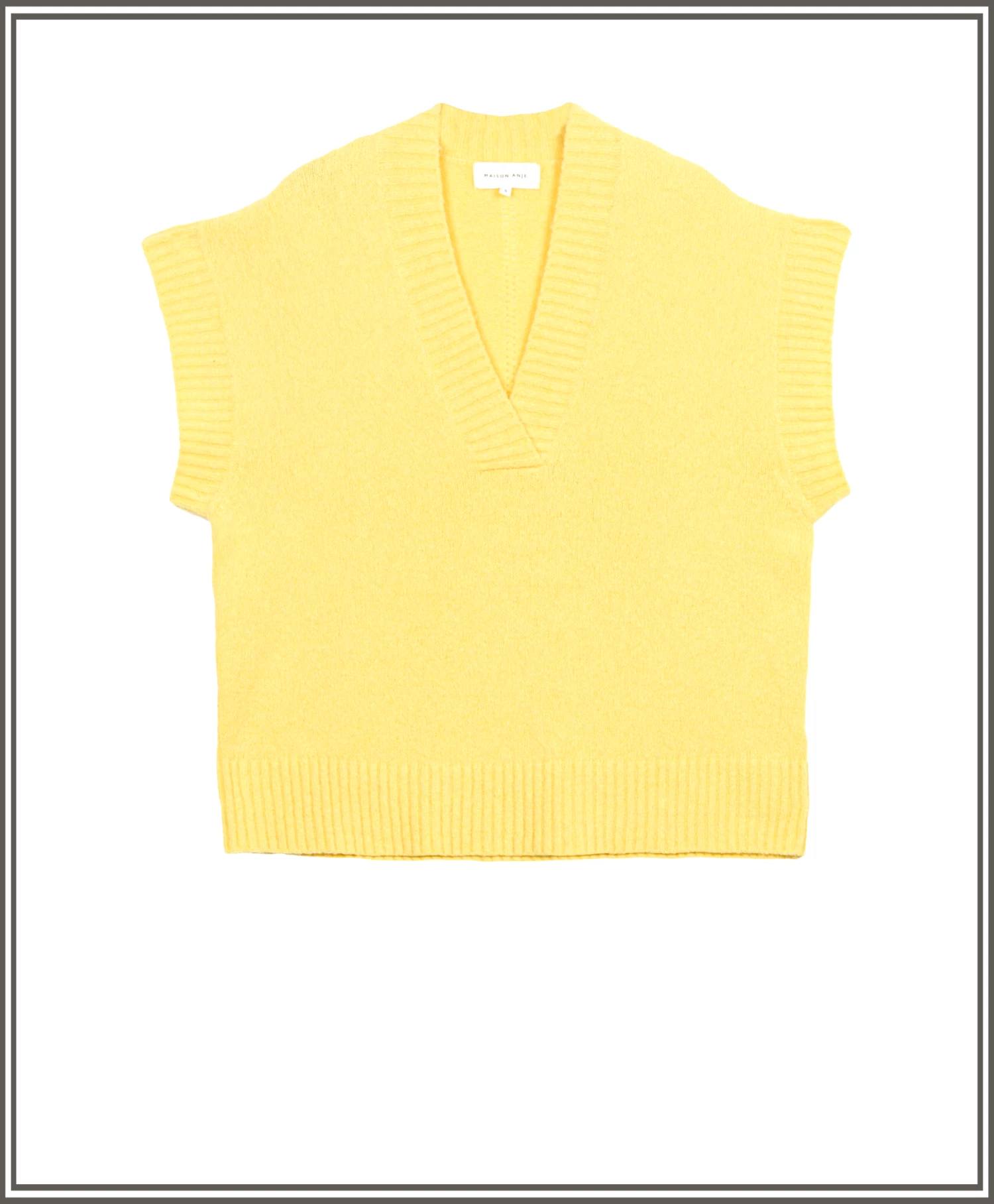 Maison Anje Lecabanon Knit Vest in Popcorn with V-neck and cap sleeve. Ribbed neckline Relaxed boxy shape Small cutout detail running down centre of back Dropped shoulders with ribbed short cap sleeves Ribbed detail at waistline Care: This Maison Anje knit is made from 32% Cotton, 30% Alpaca, 26% Polyamide, 10% Fine Merino Wool Handwash Only