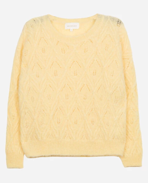 Maison Anje Lekontiki Butter Knit, a pale creamy yellow knitted jumper with long sleeves and a round neck. Lightweight and designed with a dotted pointelle detailing this loose and slouchy sweater also comes in green. Fluffy texture Stretchy Long Sleeves Boxy fit Round neck 82% Kid Mohair & 16% Polyamide Hand wash cold and dry flat to avoid stretching S – UK8-10, M – UK10-12, L – UK12-14
