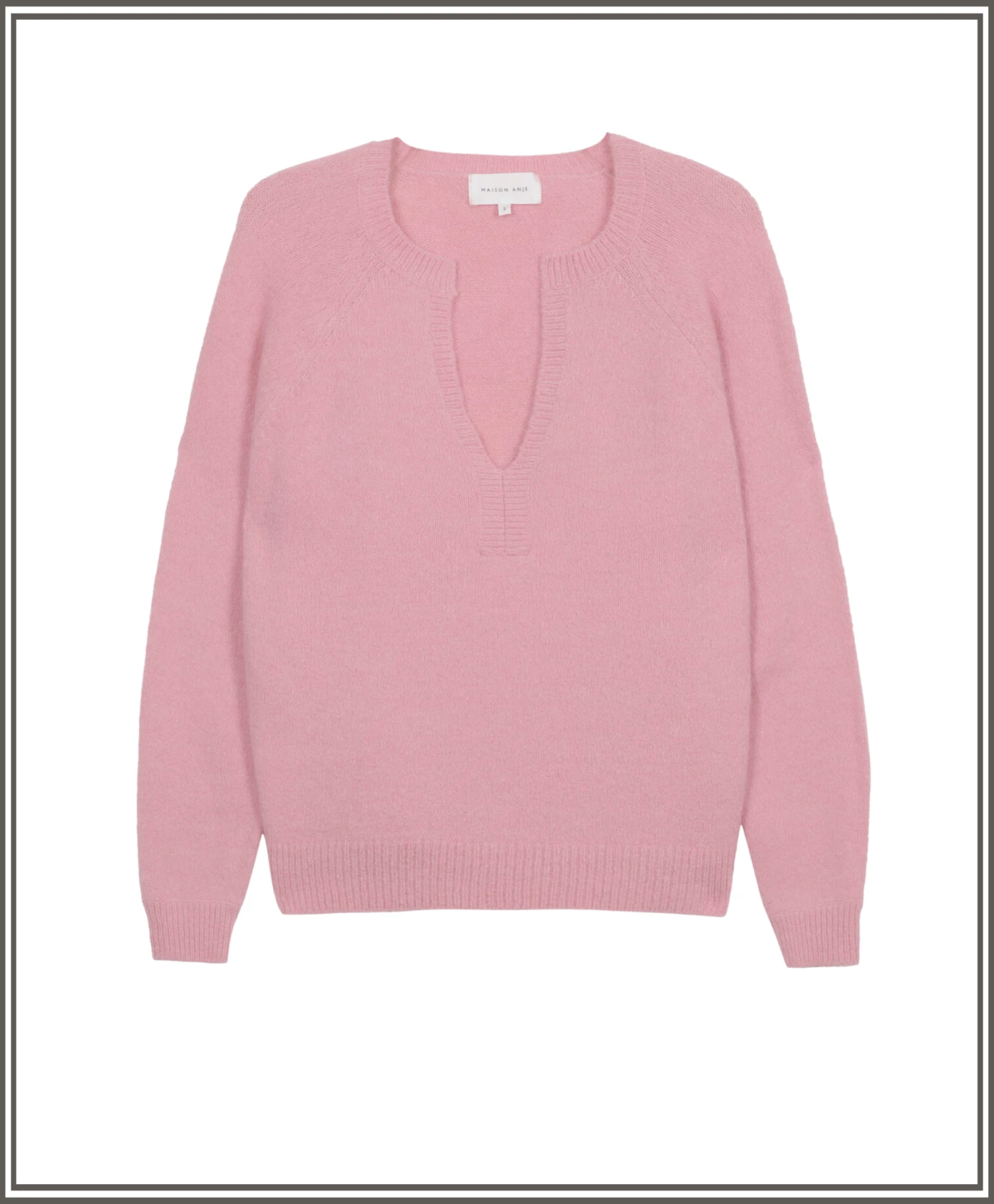 Maison Anje Lepunch V-Neck Knit in Berlingot. Material: 32% Cotton 30% Baby Alpaca 26% Polyamide 10% Fine Merino Wool 2% Elastine.