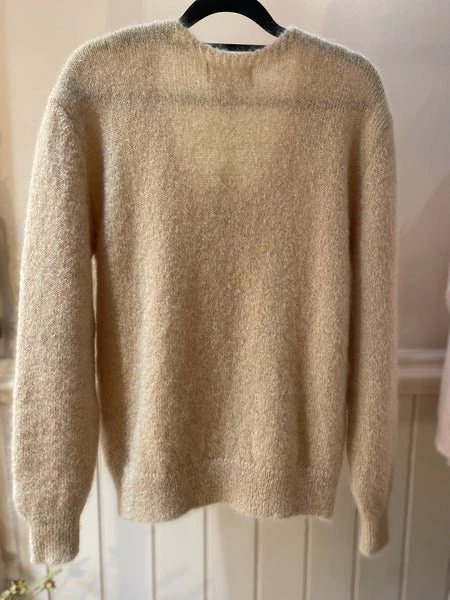 Beautiful loose knit long sleeved pull over (jumper) by French brand Maison Anje. 82% Kid Mohair 18% Polyamide V neck in latte (palest brown) colour