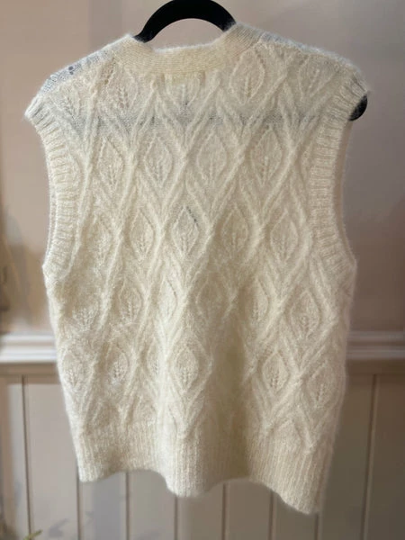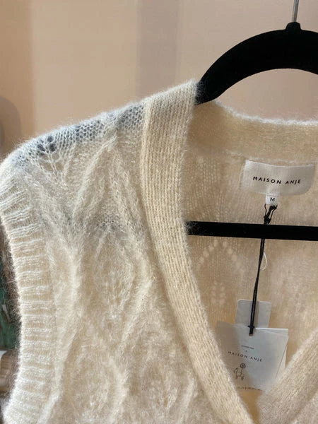 Beautiful patterned knit sleeveless cardigan (waistcoat) by French brand Maison Anje. 82% Kid Mohair 18% Polyamide Button fastenings